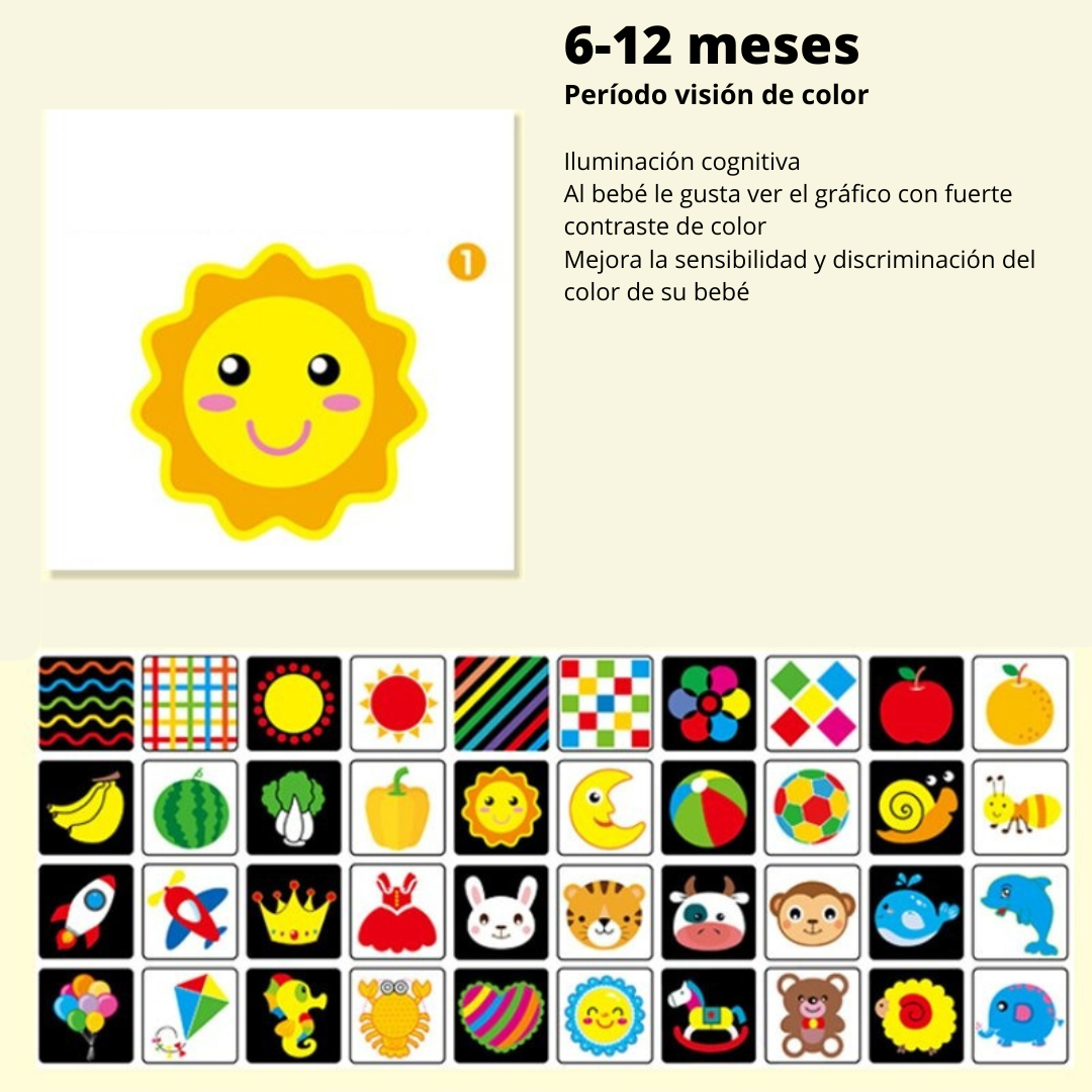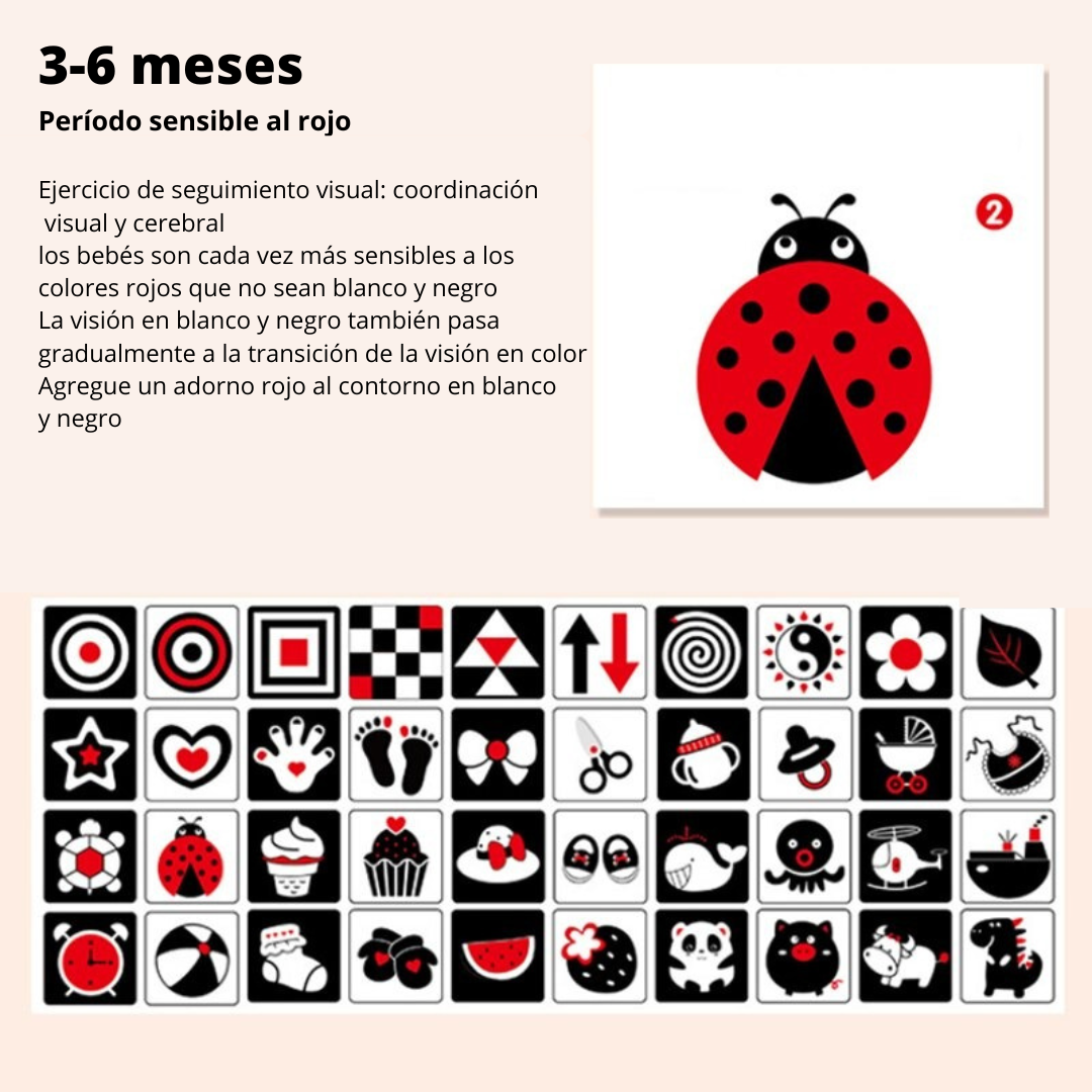 En sus primeros 3 meses, los bebés no pueden ver todos los colores, por lo que a esta edad prefieren las imágenes en blanco y negro. Nuestras tarjetas flash de alto contraste son ideales para desarrollar y estimular sus sentidos visuales.