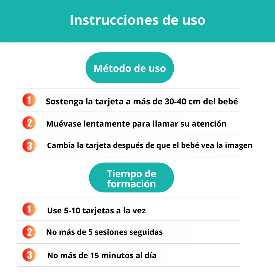Sostenga la tarjeta a unos 30-40 cm del bebé y muévase lentamente para atraer la mirada del bebé y después de que el bebé mire la tarjeta durante 5-6 segundos y luego cambie a la siguiente tarjeta. Recomendamos usar de 5 a 10 tarjetas a la vez.